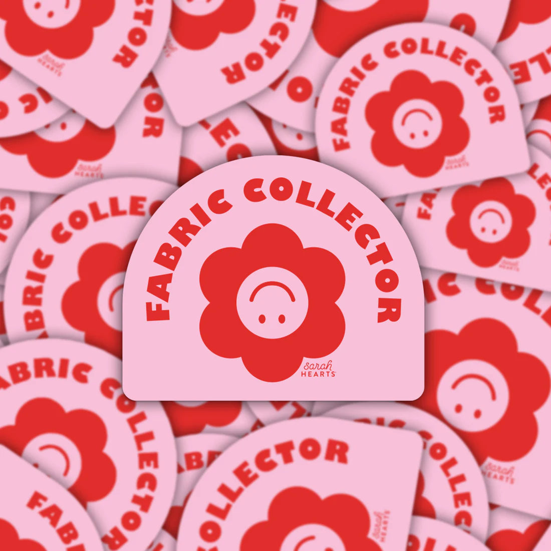 Add some fun to your space with our Fabric Collector Sticker. With an upside down smiley and vibrant red and pink daisy design, it's perfect for placement on any hard surface. This sticker is a must-have for any fabric enthusiast.